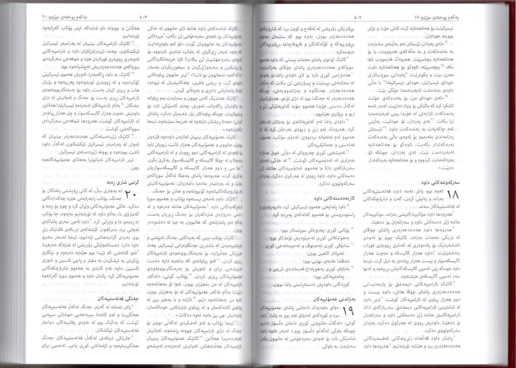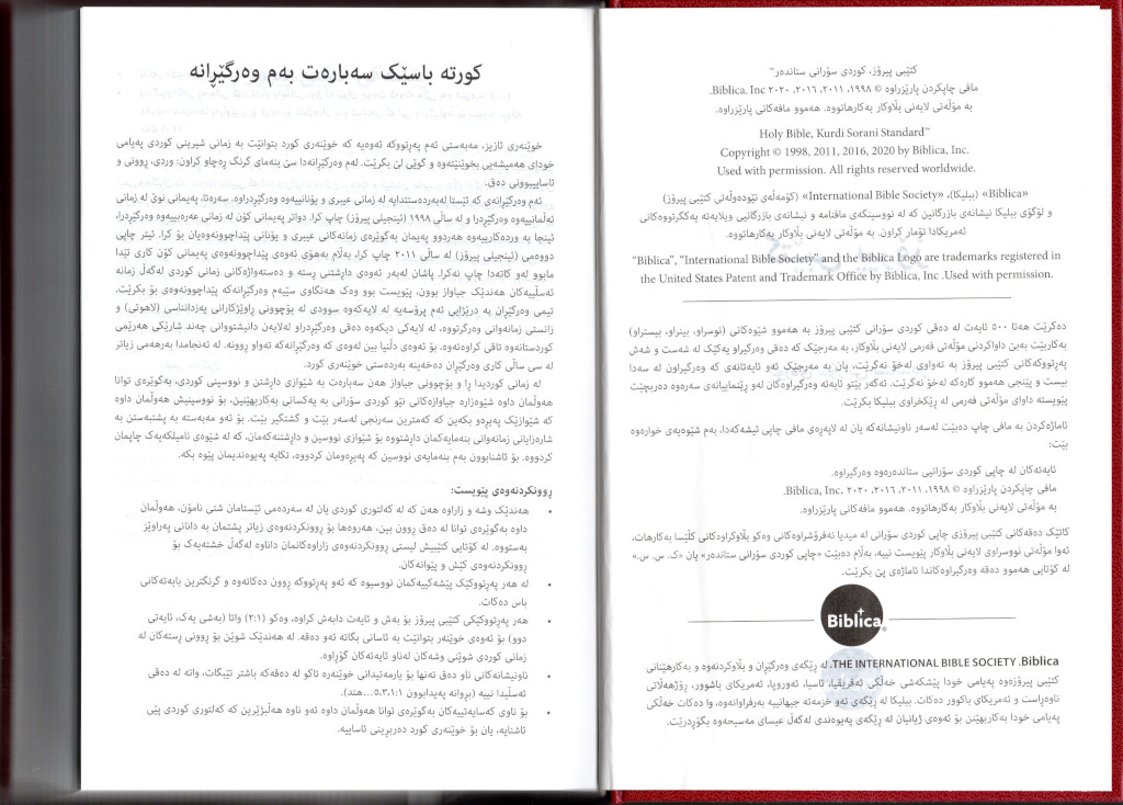 Übersetzung: كوردی سۆرانی ستاندهرد (Kurdi Sorani Standard)Die erste Bibelübersetzung ins Soranische, aus den Urtexten und vom Sprachstil Richtung Schlachter 2000Eine besondere Auflage: (Nur) das Alte Testament in einer großen Ausgabe.