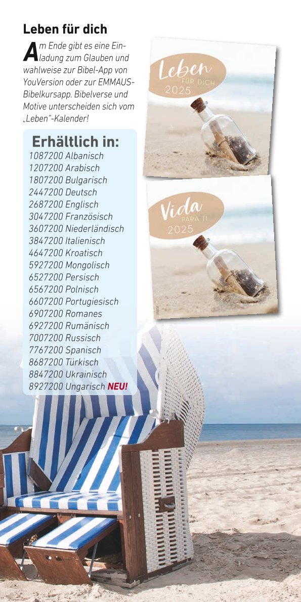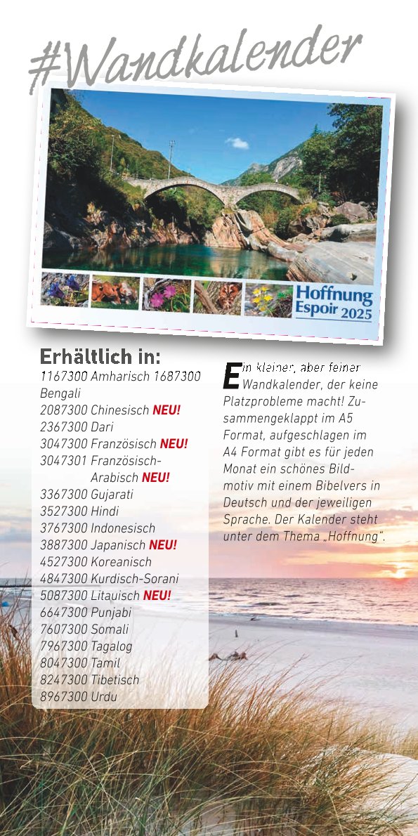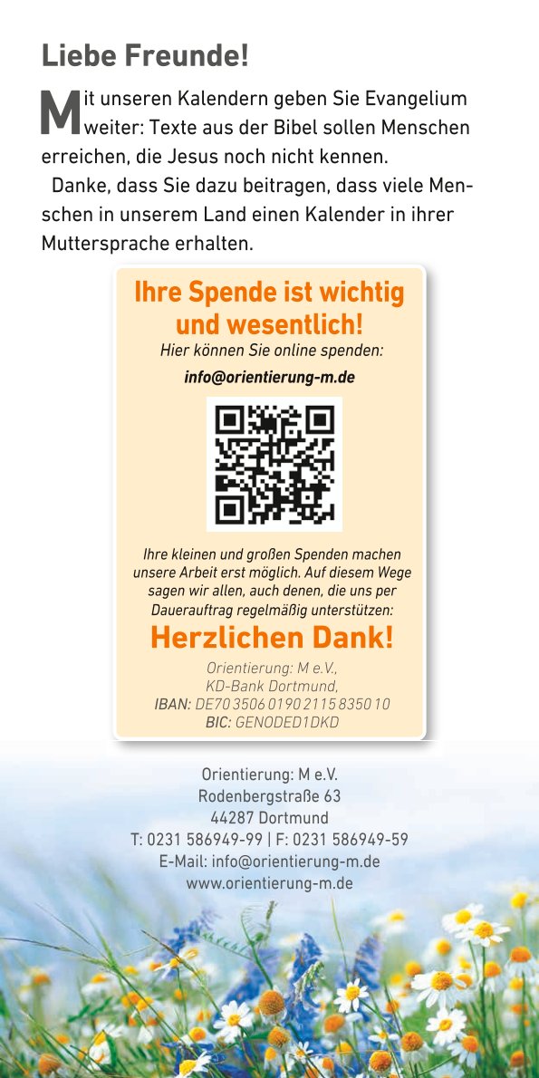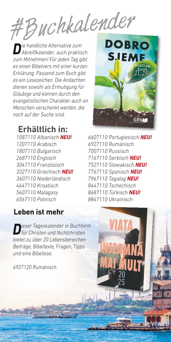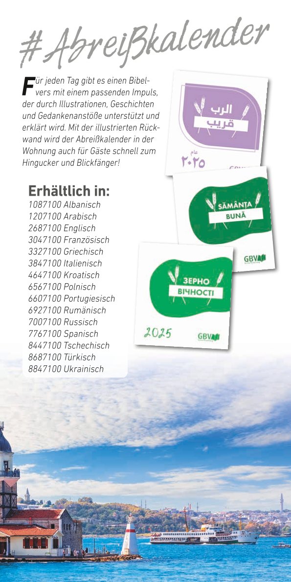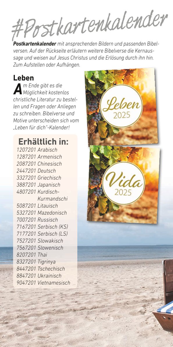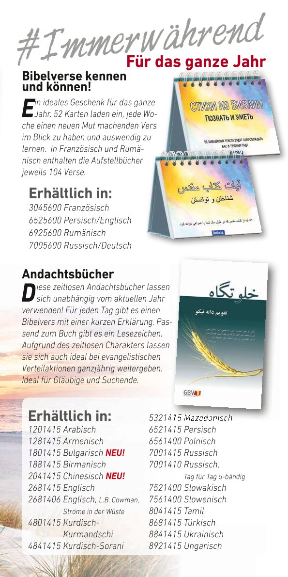 Ein Verteilkärtchen mit den Telefonnummern zu Andachten in unterschiedlichen SprachenDie Telefonandachten folgen dem Programm Thru the Bible von Dr. J. Vernon McGee. Die Andachten sind weniger evangelistisch, eher ein fortlaufendes Bibelstudium durch die biblischen Bücher. Nach einem Buch aus dem Altem Testament folgt ein Buch aus dem Neuen Testament usf. Eine Andacht ist etwa 20-25 Minuten lang. Online finden Sie die Andachten in Deutsch unter ttb.twr.org, weitere Sprachen sind unter "Sprachen" links oben über der Überschrift "Durch die Bibel" aufgelistet. Sie können die Andachten dort lesen, hören, herunterladen und teilen. Und mit der App „THRU the BIBLE“ reisen Sie in einem systematischen Studium durch die Bibel. Download für Android und für iOS