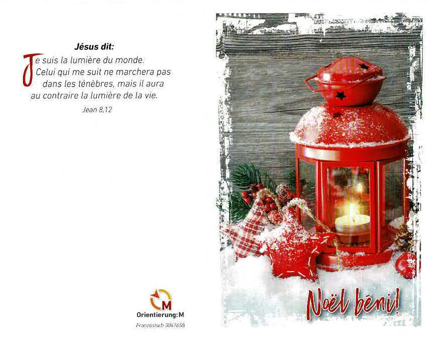 Eine Weihnachtskarte mit dem Gruß "Gesegnete Weihnachten!"Auf der Innenseite befindet sich die Weihnachtsgeschichte aus dem Evangelium nach Lukas 2, Verse 1- 14 und Platz für einen persönlichen Gruß.Auf der Rückseite steht der Bibelvers aus Johannes 8,12: "Jesus spricht: Ich bin das Licht der Welt. Wer mir nachfolgt, wird das Licht des Lebens haben."Die Weihnachtskarte mit gleichem Text führen wir auch in: Arabisch, Bulgarisch, Deutsch, Englisch, Französisch, Persisch, Polnisch, Rumänisch, Russisch, Türkisch und Ukrainisch.