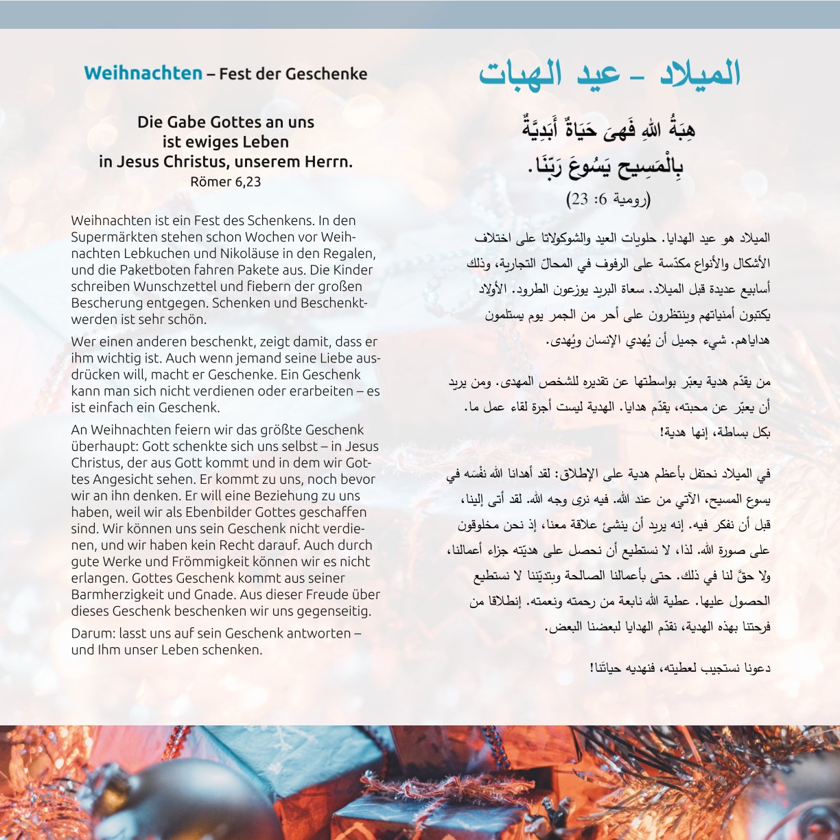 Evangelistische Faltkarten: Weihnachten - Fest der Geschenke, Arabisch-Deutsch - 5er Pack