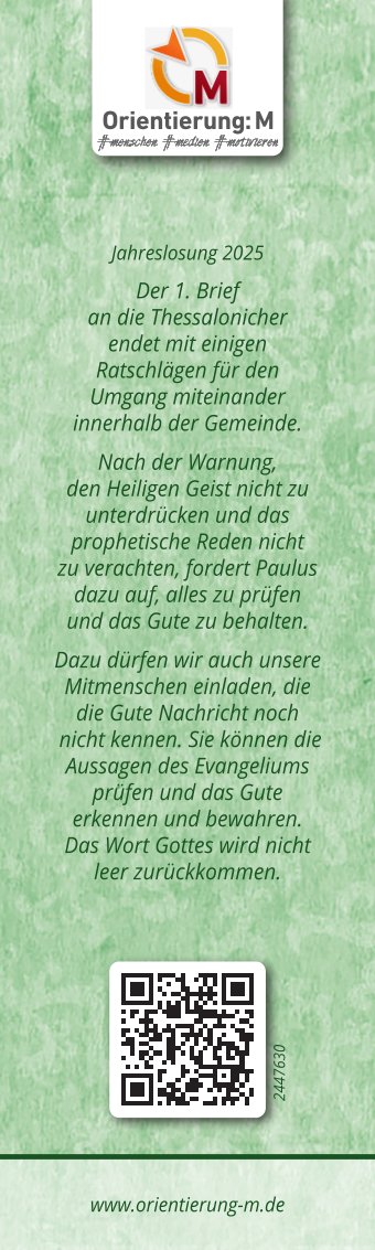 Lesezeichen Jahreslosung 2025, 10er PackAuf der Vorderseite befindet sich der Bibelvers aus 1.Thessalonicherbrief 5,21: Prüft alles, das Gute behaltet!Auf der Rückseite befindet sich eine kurze Auslegung zu dem Vers und ein QR-Code, welcher zu unserem Medienangebot führt.Sowie der Link zu unserer allgemeinen Homepage.Bitte beachten Sie: 1x im Warenkorb bedeutet 10 bestellte Kärtchen. Wenn Sie sie 10x in den Warenkorb legen, werden Ihnen 100 Kärtchen zugeschickt.
